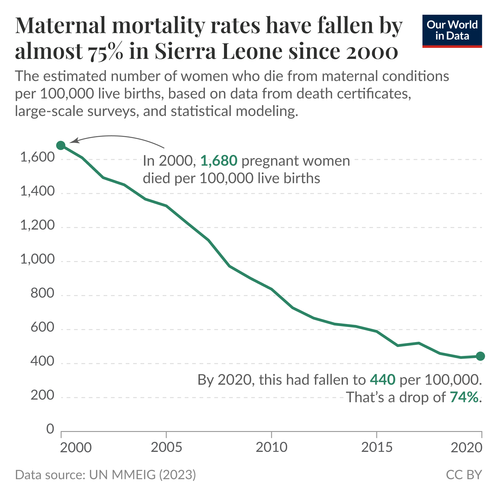 The maternal mortality rate in Sierra Leone has fallen by 75% since 2000. From 1,680 mothers perishing for every 100,000 live births in the year 2000 to just 440 per 100,000 two decades later in 2020.