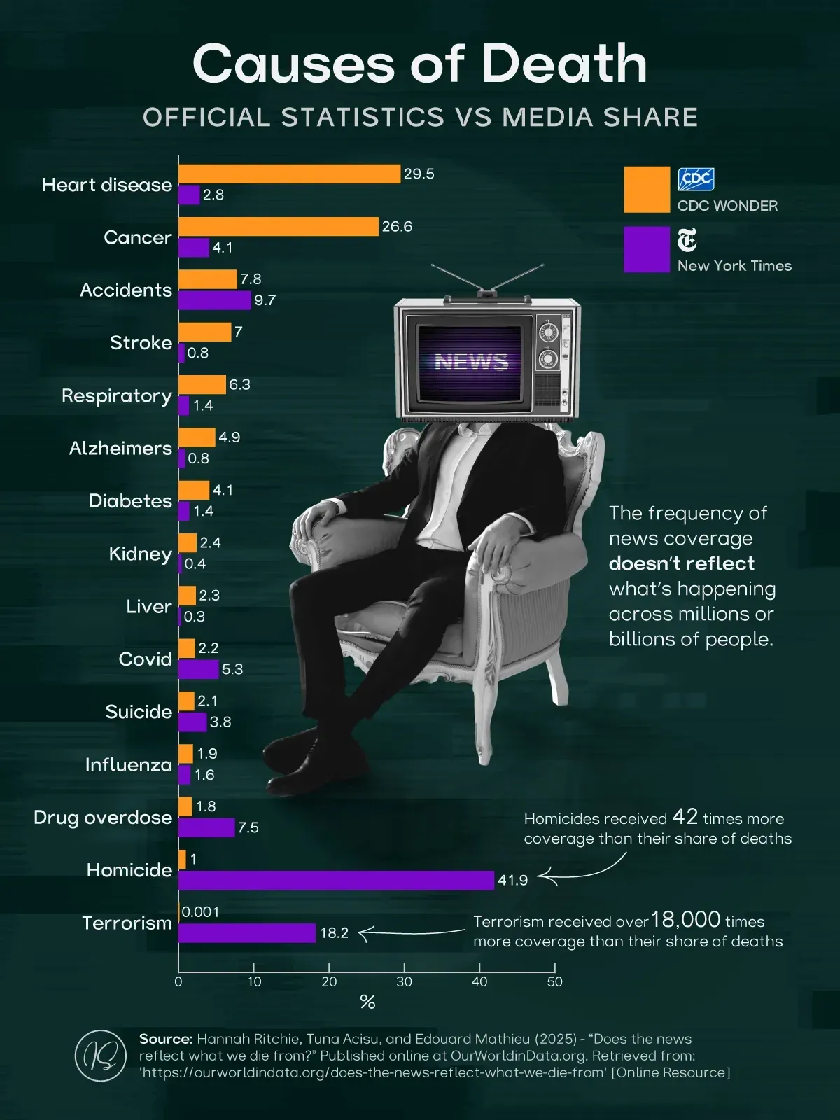 “The actual distribution of deaths is very different from the causes of death that the media talks about. Rare — but dramatic — events such as homicides and terrorism receive much more media coverage, despite being much smaller causes of death.”