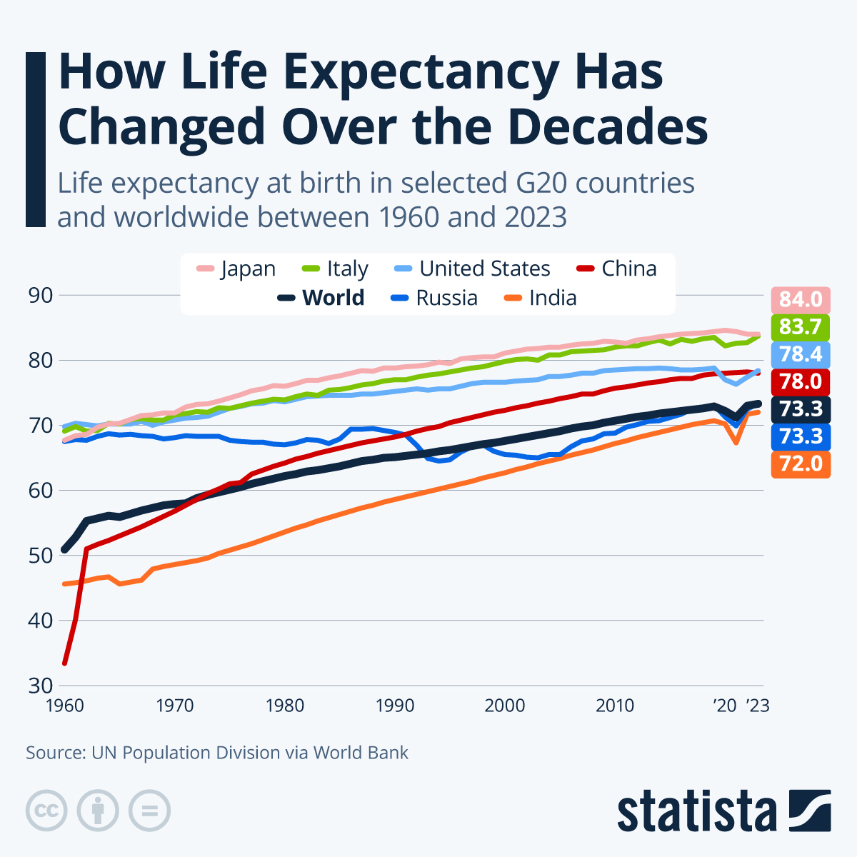 “Globally, average life expectancy increased from about 51 years in 1960 to 73.3 years in 2023, an average gain of more than 20 years in the space of six decades, despite a temporary setback during the coronavirus pandemic.”
