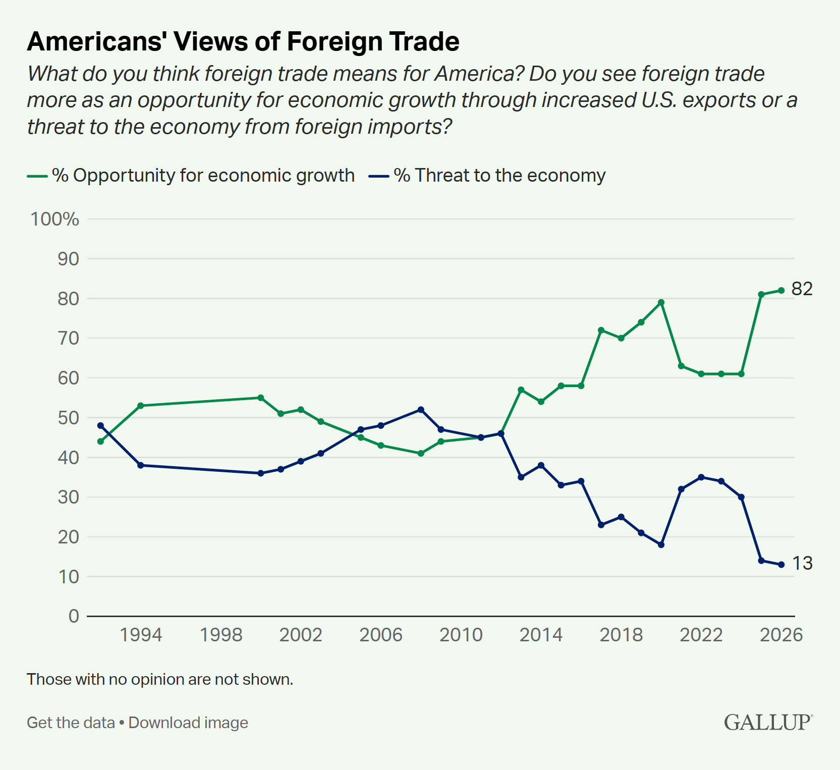 “Gallup’s annual measure tracking Americans’ views of the economic impact of foreign trade finds a steady 82% saying it represents more of an opportunity for economic growth than a threat (13%) to the U.S. from foreign imports. Last year, this reading surged 20 points to 81%, which was similar to the prior high of 79% at the end of Trump’s first presidential term.”