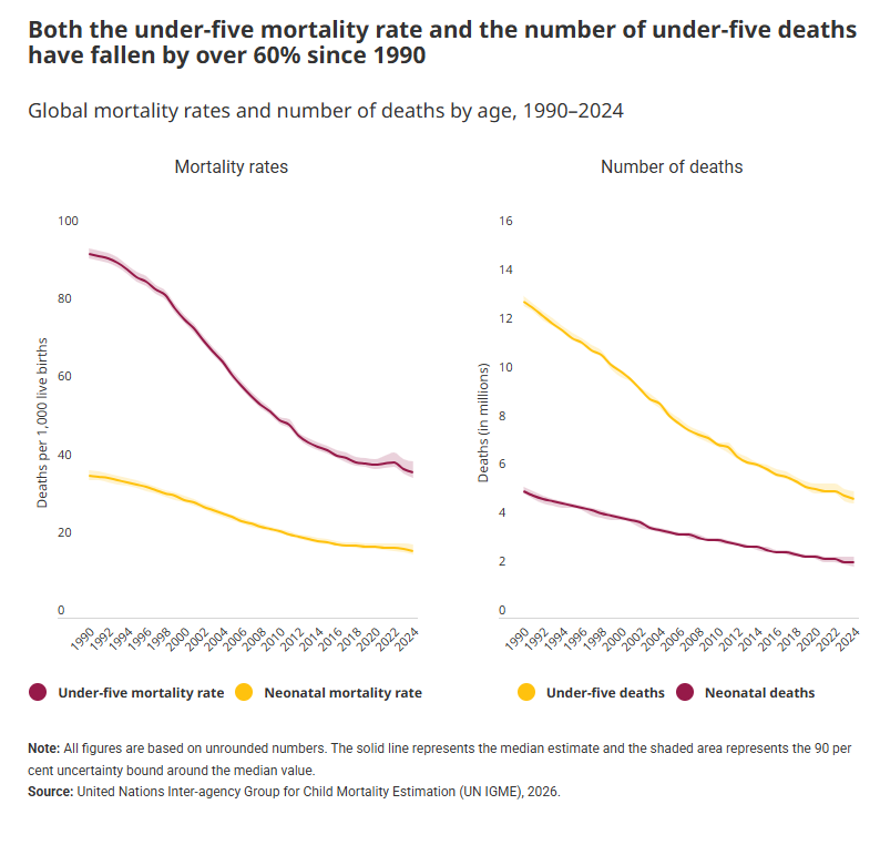 “Since 1990, the world has made remarkable progress: the under five mortality rate has fallen by about 60 per cent, and neonatal mortality by 45 per cent, saving millions of young lives. These gains reflect decades of investment in immunization, essential health services, newborn care, nutrition support and the integrated management of childhood illnesses.”