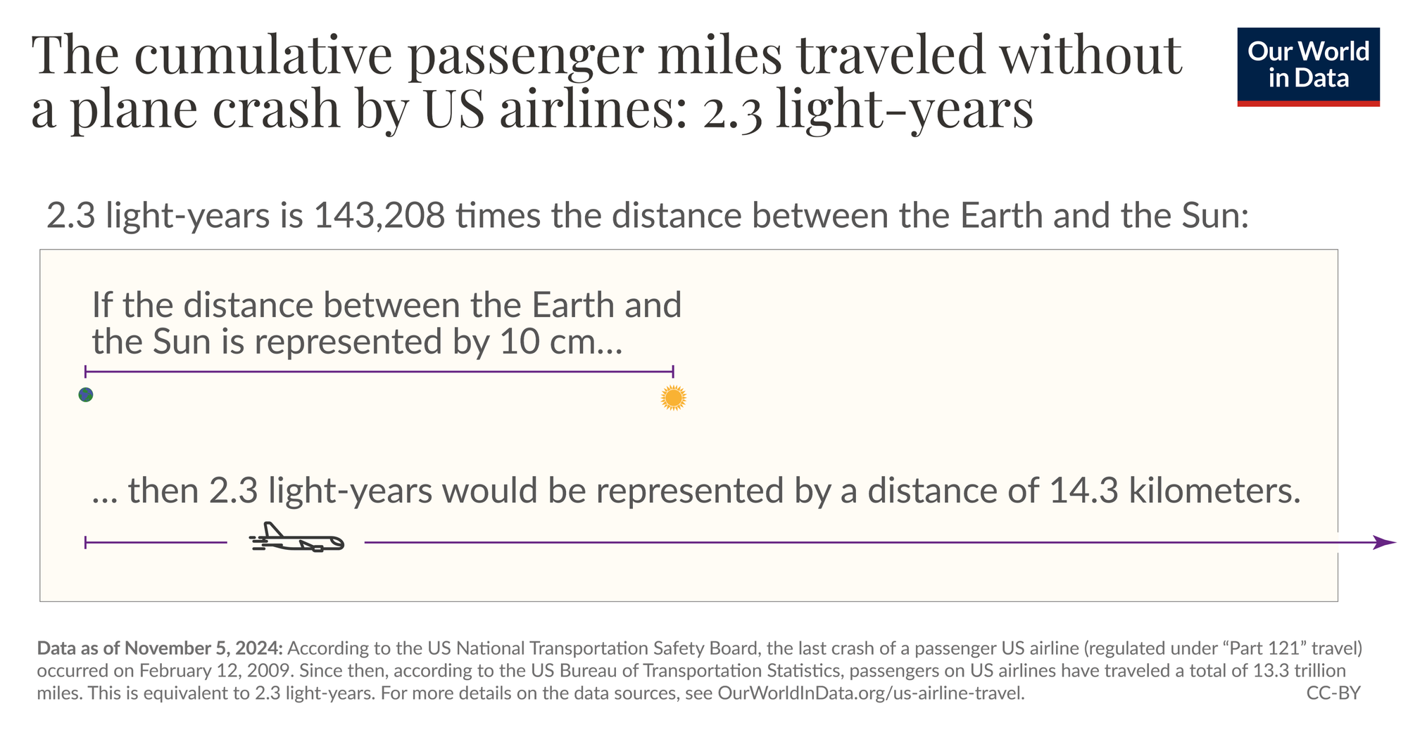US airlines have flown 13.3 trillion passenger miles (21.4 trillion passenger kilometres) since the last major crash in 2009. As Our World In Data puts it, "It’s equivalent to 535 million trips around the Earth or 28 million visits to the moon and back."