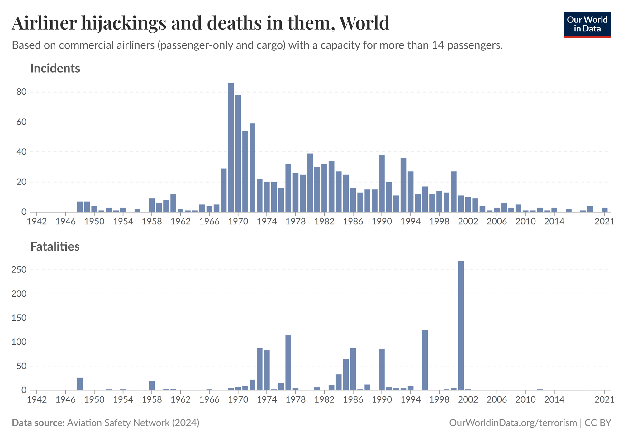 Globally, between 1970 and 2021, the number of fatal airliner accidents per million commercial flights fell from 6.4 fatalities per million flights to just 0.46. Put another way, the global airline industry flew nearly 210,000 passengers safely, for every tragic life lost flying in 1970. However, by 2021, that figure had climbed to 18.5 million passengers flown safely for each life lost; an increase in the number of people flown safely per life loss of 8,700%. Other safety risks, such as hijackings, have declined dramatically, in both the number of total incidents and the number of resulting deaths, especially so when discounting the tragedy of 9/11 as a statistical outlier.